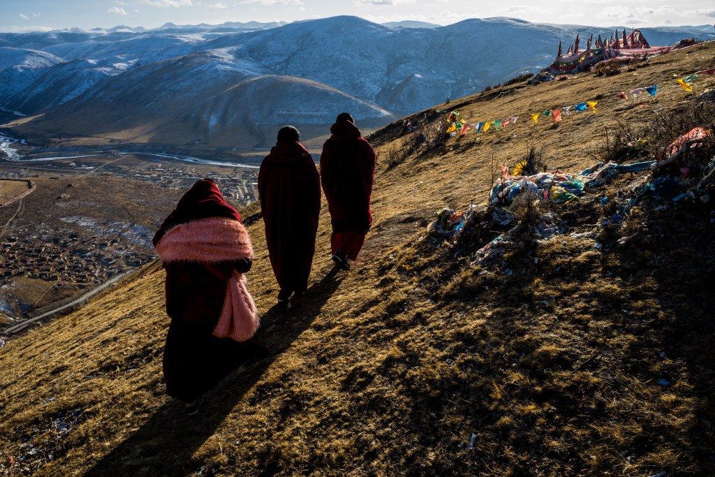 Monks from the country-side take their friend for a walk to the grasslands